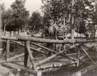 Photo of Thomas Donnelly (b. 1875) and his son Francis (b. 1919) on a cedar bridge built by Thomas at Innisfil Park., IHS582