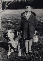 Dorothy Pratt on her first day of school, at the Fifth Line School, SS #7, Churchill. Circa 1932 - Notice lunch pail, a, IHS3579s, IHS3819