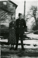 Photo of a uniformed man and older woman in a floral print dress. The pair are outdoors, snow is on the ground and a, IHS 4470