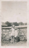 Photo of two young girls identified as Flo and Shirley standing in front of a stone wall in Innisfil Park in 1944.