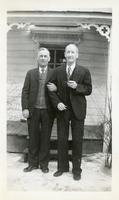 Photo of brothers Jack and Alexander Constable wearing dark coloured suits and posing in front of the porch of a house.