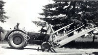 Photo of a buckrake in use on the Harold Wallace farm. Buckrakes were a type of hay rake designed to travel along a hay, IHS1911