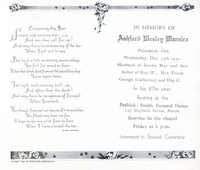 Copy of the funeral card for Ashford Wesley Warnica. The text includes a poem as well as the following information: "In