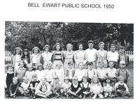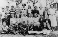 Photo from 1950 of three young eighth grade girls standing outside of Killyleagh School, S.S. #6. Pictured from left to, IHS678