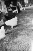 A flock of hens kept for eggs at the J.W. Reid home, with Mr. Reid in chair., IHS2198