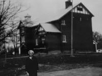 Mrs. Earl Wice (nee Hilda Hoover) in front of Stroud School built 1923 for $21,000 - demolished in 1976. Mrs. Wice, IHS2486