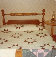 Colour photo of the interior of Barclay House when it functioned as a tea room. The image shows a bed with a star