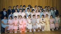 Class photo taken of the Cookstown Central School's graduating class in 1985. This colour photo shows a number of young,