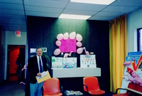 Merv Wice standing in Credit Union Innisfil, he is next to a pink sign celebrating his 50th Birthday. Wice worked for