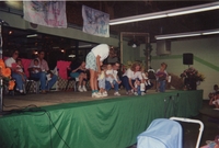 Stage view of the 1992 Baby contest at Cookstown Agricultural fair. The are three adults at the front of the stage