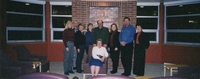 A photograph taken at the original Lakeshore Library branch, in front of the brick fire place. The photo includes eight
