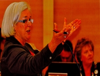 Photograph of Veterans book coordinator Donna Wice encouraging veterans or their family members to stand, to be, 4457