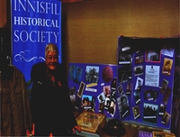 Photograph of Innisfil Historical Society President, Marj Mossman, standing next to a display of Innisfil veterans at, 4458