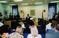An officiant at the Canada Day Citizenship ceremony giving an address to the future/new Canadian citizens. The