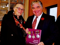 Photograph of Barb Love and MP Peter Van Loan holding up the book “Innisfil Veterans: Their Lives and Memories” during, 4454