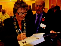 Photograph of Major Barbara Baguley signing Veteran John Battle's “Innisfil Veterans: Their Lives and Memories” book at, 4455