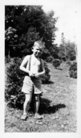 Photo of Ross Sanford Law at a young age wearing shorts and suspenders in a grassy and treed area. Ross was born 20 July