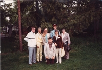 Colour photo taken at the Ottawa Safety Patroller Rally circa 1980 of a group of people standing in front of some trees.