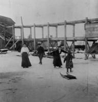Four skaters on Lake Simcoe at the foot of Arnold Street in Belle Ewart with the structures for the Belle Ewart Ice, IHS420