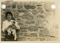 Photo of Margaret Armstrong McConkey (Barclay) in a white shirt holding a small puppy in her left arm. She is leaning