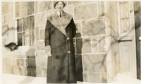 Photo of Eleanor Elizabeth Zeta Barclay, known as Zeta, outside of the Barclay home. She is wearing a long wool coat and
