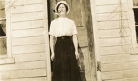 Photo of Eleanor Elizabeth Zeta Barclay, known as Zeta, outside of the Barclay home. She is wearing a white blouse and