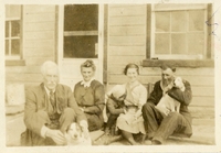 Photo of the Barclay family posing with their dogs on the front stoop of the Barclay home. Pictured from left to right