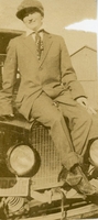 Photo of Eleanor Elizabeth Zeta Barclay (later Sharpe, later Parker) wearing a suit, tie, and cap seated on the hood of