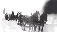 Photo of John Boyes II, road foreman, clearing snow with two teams of horses in front of the Churchill Presbyterian , IHS2669