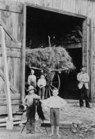 Children with camera in door of barn, showing hay wagon. Man at right Mr. Thompson., IHS3684