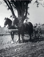 Lemuel Hubbert scuffling corn with a two-row scuffler and a team of horses., IHS1657