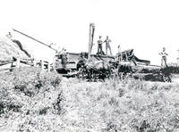 Threshing machine and farmers and horses in a field., IHS86