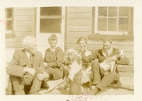 Photo of the Barclay family posing with their dogs on the front stoop of the Barclay home. Pictured from left to right