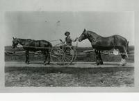Photo of Robert Henry "Harry" Thompson in a horse drawn cart. He is holding the reins of the horse with one hand, and, IHS 4391