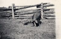 Photograph of Jenny the sow with several of her piglets on the Ross farm in Cookstown. The date of the photo is unknown.,