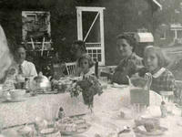 Photograph of the Posno family dining outdoors. Pictured are Reverend Posno, Mrs. Posno, Helen, and Betty.,