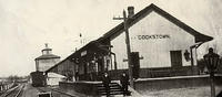 Photo of the exterior of Cookstown's Canadian National Railway Station taken in the mid-1910s. The photo shows two men,