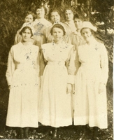 Photo of eight unidentified women in nursing uniforms, with the first three women in the front row wearing caps. The