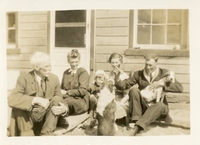 Photo of the Barclay family posing with their dogs on the front stoop of the Barclay home. Pictured from left to right