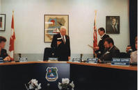 Mayor Stewart Fisher is sworn in by Clerk Paul Landry. Present are Councillors Brian Jackson and Laurie Franks, and, IHS4296