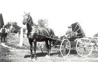 Percy Thompson driving a horse drawn buggy. He was the first husband of Mrs. Bertha Stewart, whose father Tom Atkinson, IHS984