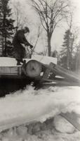 Photo of John S. Ferguson using ice tongs to grip and move ice blocks after they came up a conveyor belt. John is, IHS1915