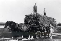 Photo of the hay harvest on the Fred Lucas farm in 1930. The image shows two draft horses pulling a wagon stacked quite, IHS1604