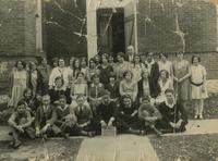 Class photo of the Cookstown Continuation School class of 1930. The students are lined up and posed in front of an open,
