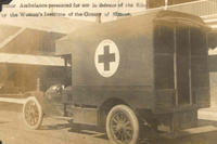 Photo of a motor ambulance presented for use in the defence of the Empire by the Women's Institute of the County of,