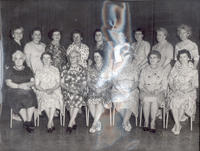 Posed portrait of the ladies of the United Church wearing dresses. Pictured from left to right in the back row are: