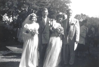 Photograph of newlyweds Dorothy Pratt and Parker Peacock outdoors with their wedding guests in the background.