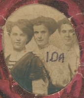 Picture of three women, one unidentified, one Ida Wellington (centre), and one Mrs. Charlie Woods, inside a small flower