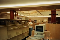 Photograph of the librarian's office area at the stroud branch of Innisfil Public Library. Susan Downs can be seen