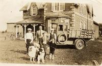 Photograph of the Ross Family standing in front of the family home, with a stacked truck featuring a spare tire on the